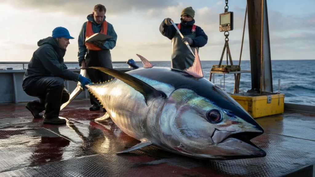Maria had been studying fish for twelve years, but she still remembers the exact moment she realized the thing on deck wasn’t going to fit on any normal scale. The giant bluefin tuna stretched nearly eight feet from nose to tail, its silver-blue body catching the morning sun like polished metal. Her measuring tape ran out at six feet, and she had to call for backup equipment.